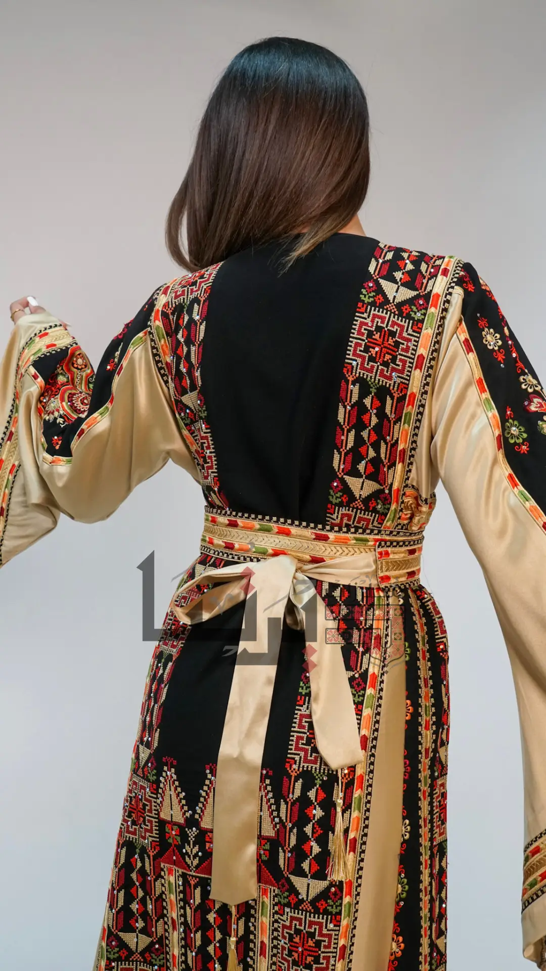 Command attention in this magnificent Gold and Black Embroidered Kaftan. This piece is a masterpiece of festive attire, blending the dramatic contrast of black and gold with rich, traditional Tatreez-inspired needlework. It is designed for the most celebratory and grand occasions.